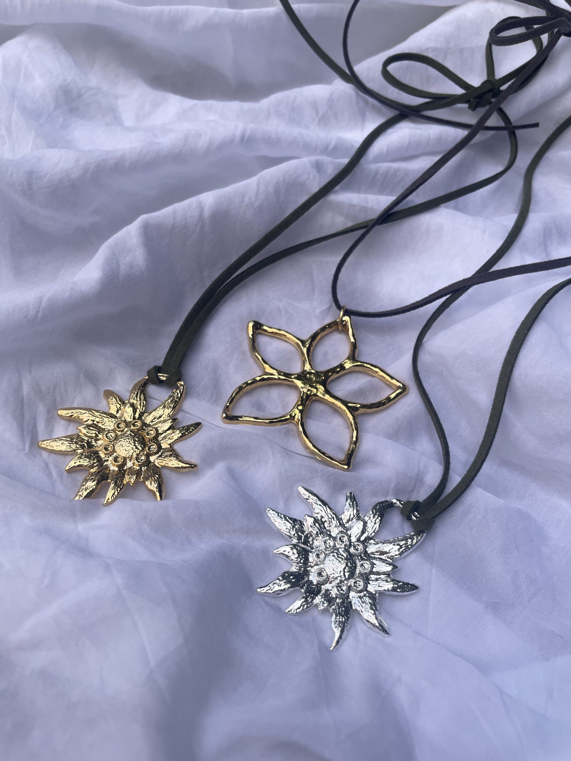 שרשרת חוט דמוי זמש בצבע ירוק עם תליון שמש גדול בציפוי כסף