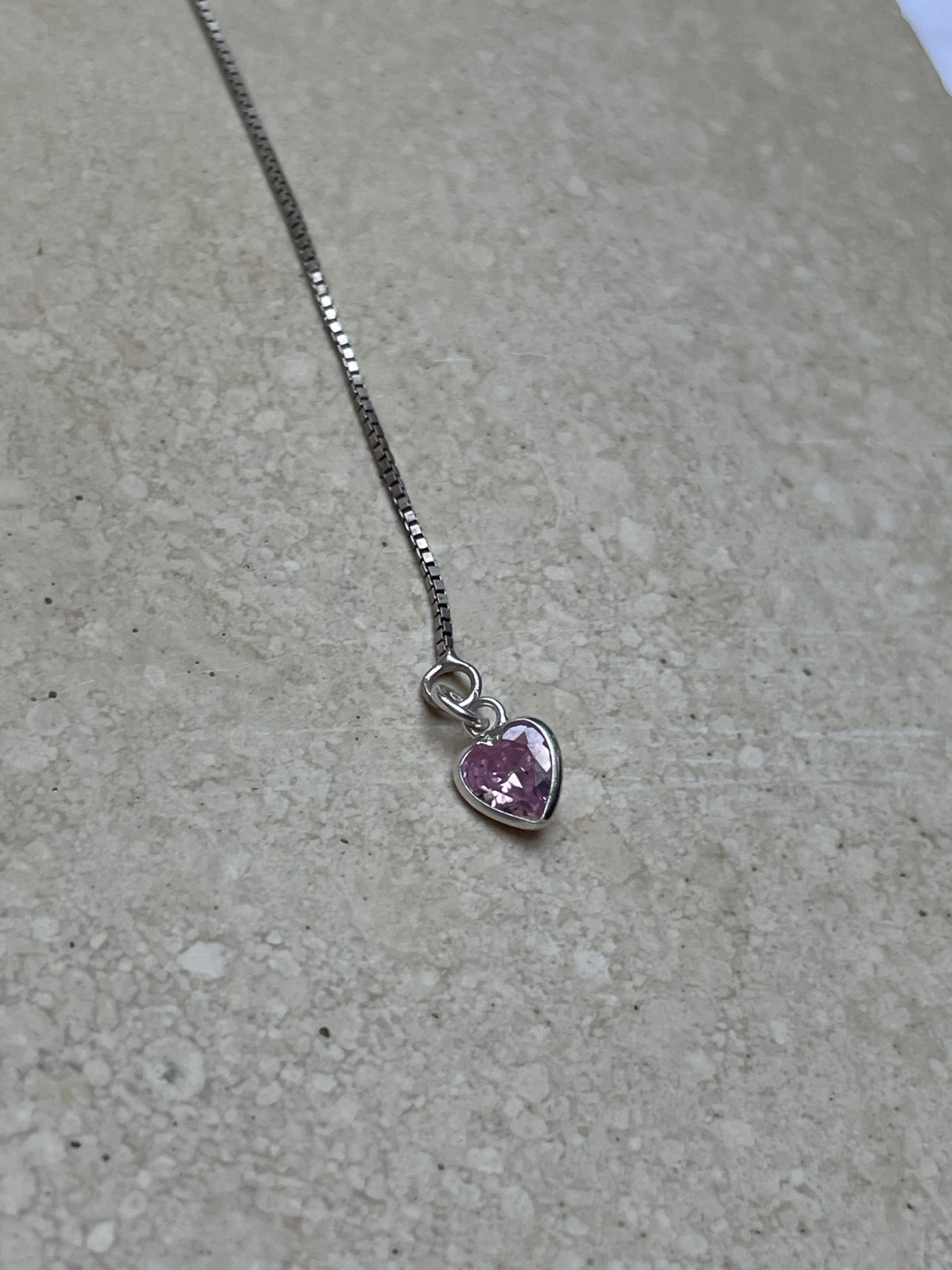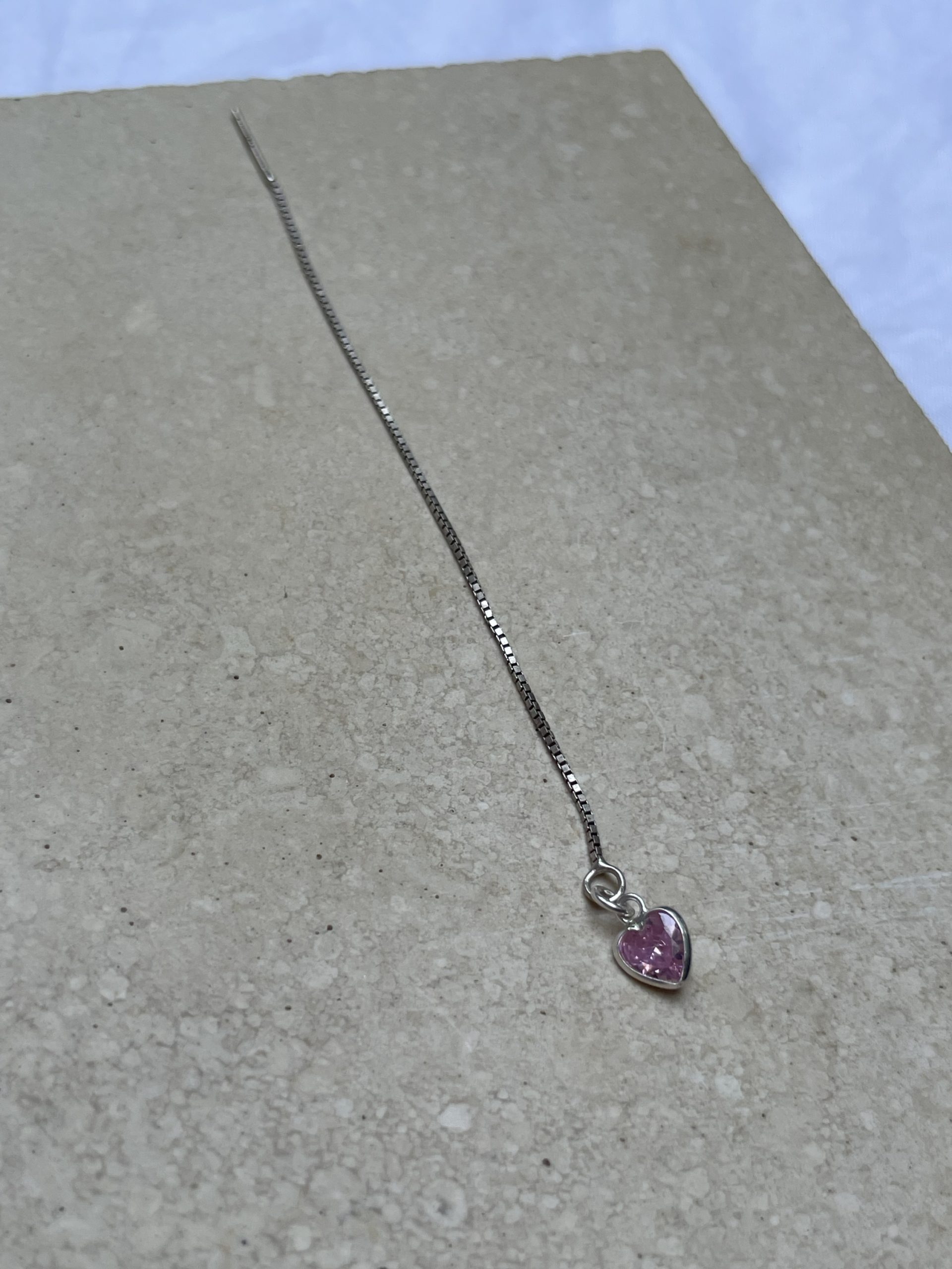 עגיל שרוך מושחל עשוי שרשרת דקה עם תליון לב ורוד במסגרת כסף